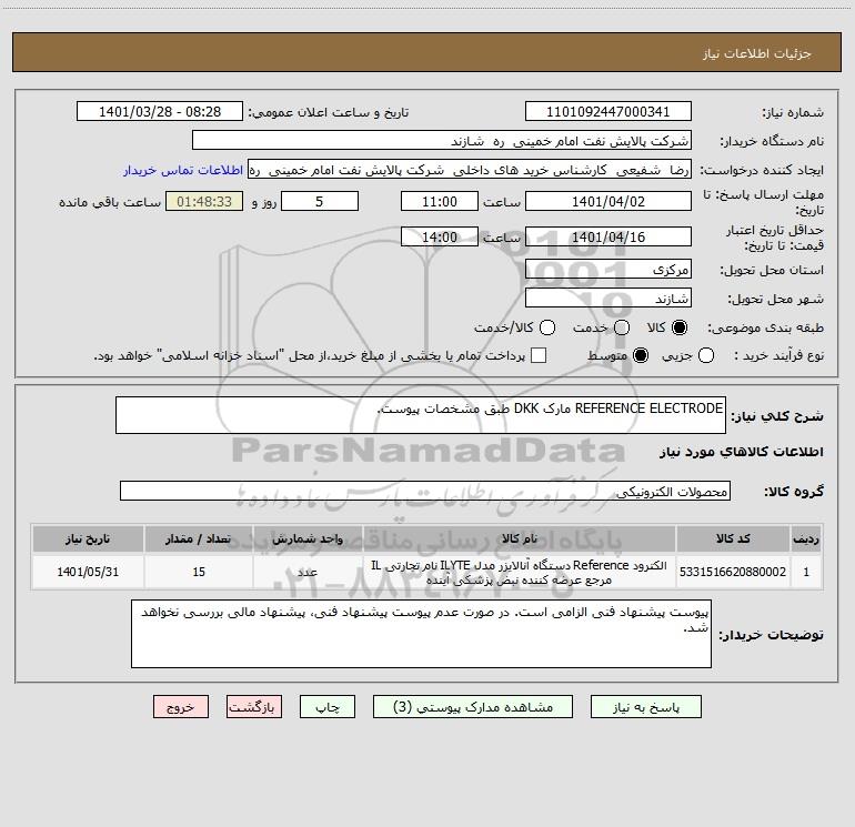 شرح کلی نیاز: REFERENCE ELECTRODE مارک DKK طبق مشخصات پیوست.