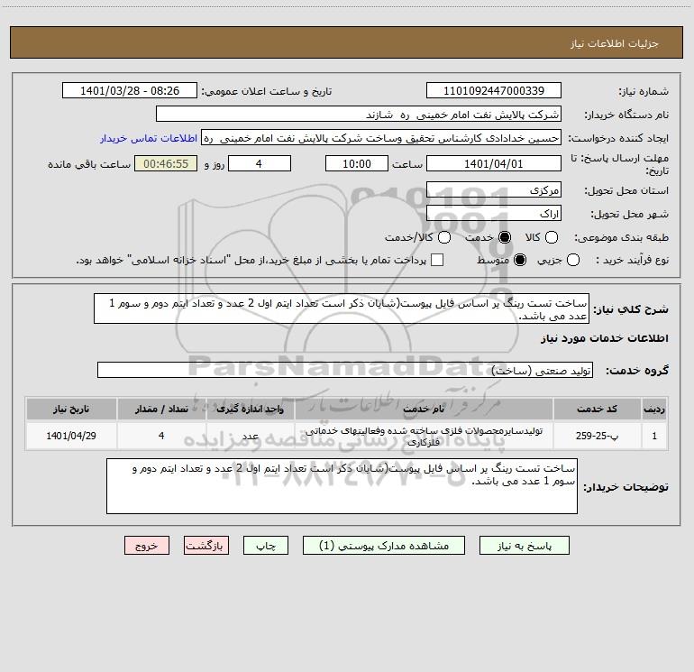 استعلام بها و موضوع استعلام استعلام ساخت تست رینگ یر اساس فایل پیوست(شایان ذکر است تعداد ایتم اول 2 عدد و تعداد ایتم دوم و سوم 1 عدد می باشد. به اطلاع کلیه شرکتها و افراد متخصص واجد شرایط میرساند، آگهی گذار در نظر دارد از طریق استعلام بها، نسبت به انتخاب و دریافت پیشنهادات اقدام نماید. این استعلام با کد آگهی ثبت شده در سامانه خبرگزاری پارس نماد : 4623997 منتشر شده است. مشخصات استعلام : تاریخ شروع استعلام: 1401/03/28 آخرین مهلت ارسال پیشنهاد قیمت : 1401/04/01 و محل اجرای پروژه : استان مرکزی میباشد. استعلام قیمت مورد درخواست : استعلام ساخت تست رینگ یر اساس فایل پیوست(شایان ذکر است تعداد ایتم اول 2 عدد و تعداد ایتم دوم و سوم 1 عدد می باشد. با دستهبندیهای تخصصی و گروه های مرتبط : صنایع حرارتی و برودتی, لوله و اتصالات, برج های تقطیر،مخازن تحت فشار و مبدل های حرارتی, تجهیزات نفت و گاز, استعلام اطلاع رسانی میگردد.