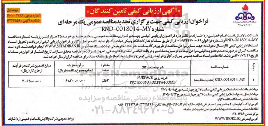 | RND-0018014-MY | خرید رزین PURPACK PPC100, PPA400, PPA400 MB | 3 قلم | 61.300.000.000 | 3.065.000.000 |