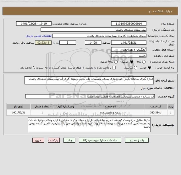 شرح کلی نیاز: اندازه گیری سامانه پایش خوداظهاری پساب وپسماند وآب شرب ونمونه گیری آب بیمارستان شهدای باشت