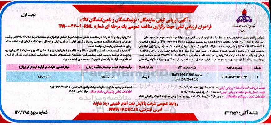 شرکت پالایش نفت امام خمینی (ره) در نظر دارد فراخوان ارزیابی کیفی جهت برگزاری مناقصه عمومی یک مرحله ای ساخت 555 & 267 & 515 -HAIR PIN TUBE E به شماره مناقصه pnl- 0047009-TW ) و شماره فراخوان 2001092447000048 را از طریق سامانه تدارکات الکترونیکی دولت برگزار نماید کلیه مراحل برگزاری فراخوان ارزیابی کیفی از دریافت و تحویل اسناد استعلام ارزیابی کیفی تا ارسال دعوت نامه جهت سایر مراحل مناقصه از طریق درگاه سامانه تدارکات الکترونیکی دولت ستاد به آدرس ستاد ایران انجام خواهد شد لازم است مناقصه گران در صورت عدم عضویت قبلی مراحل ثبت نام در سایت مذکور و دریافت گواهی امضای الکترونیکی را جهت شرکت در مناقصه محقق سازند تاریخ انتشار فراخوان در سامانه تاریخ 1401.3.28 می باشد. اطلاعات و اسناد مناقصه عمومی پس از برگزاری فرایند ارزیابی کیفی و ارسال دعوتنامه از طریق سامانه ستاد به مناقصه گران ارسال خواهد شد