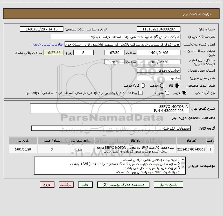 شرح کلی نیاز: SERVO MOTOR P/N 4-430000-003 مطابق DATA SHEET پیوست