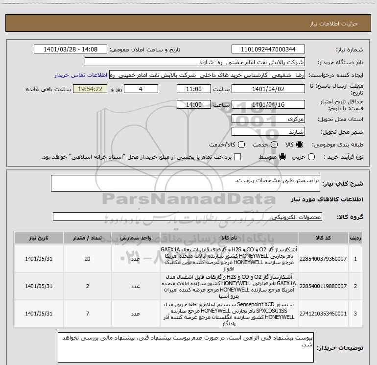 شرح کلی نیاز: ترانسمیتر طبق مشخصات پیوست.