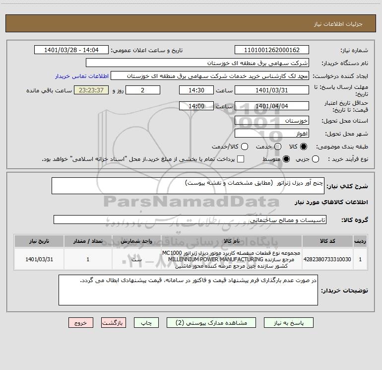 شرح کلی نیاز: چنج آور دیزل ژنراتور (مطابق مشخصات و نقشه پیوست)