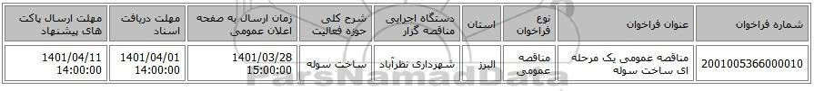 2001005366000010مناقصه عمومی یک مرحله ای ساخت سوله مناقصه عمومیالبرزشهرداری نظرآبادساخت سوله 1401/03/28 15:00:001401/04/01 14:00:001401/04/11 14:00:00