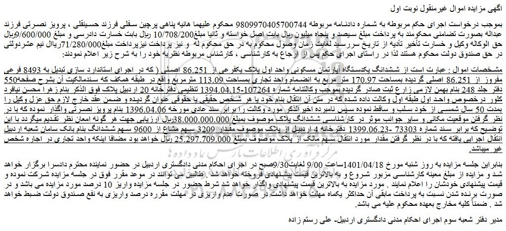 بنابراین جلسه مزایده به روز شنبه مورخ 1401/04/18ساعت 9/00 لغایت9/30صبح در اجرای احکام مدنی دادگستری اردبیل در حضور نماینده محترم دادسرا برگزار خواهد شد و مزایده از مبلغ معینه کارشناسی مزبور شروع و به بالاترین قیمت پیشنهادی فروخته خواهد شد . طالبین می توانند در موعد مقرر فوق در جلسه مزایده شرکت نموده و قیمت پیشنهادی خودشان را اعلام نمایند . مورد مزایده به بالاترین قیمت پیشنهادی واگذار خواهد شد شرط حضور در جلسه مزایده واریز 10 درصد مورد مزایده می باشد و در صورت برنده شدن نسبت به پرداخت مابقی آن حداکثر یکماه مهلت خواهد داشت در صورت عدم واریزی در مهلت مقرره درصد واریزی به نفع صندوق دولت ضبط خواهد شد . ضمناً کلیه مخارج بعهده محکوم علیه می باشد.