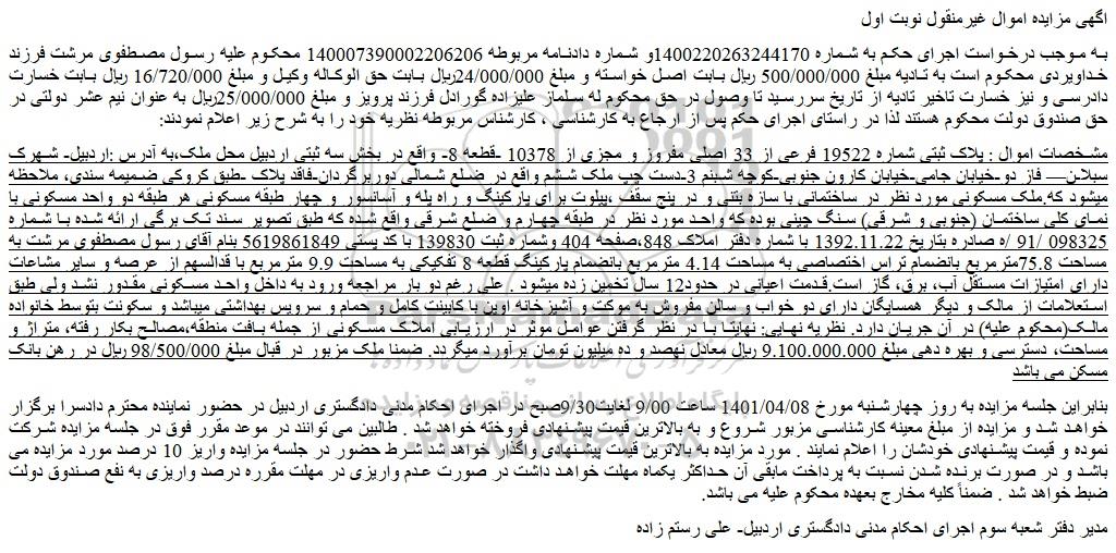 بنابراین جلسه مزایده به روز چهارشنبه مورخ 1401/04/08 ساعت 9/00 لغایت9/30صبح در اجرای احکام مدنی دادگستری اردبیل در حضور نماینده محترم دادسرا برگزار خواهد شد و مزایده از مبلغ معینه کارشناسی مزبور شروع و به بالاترین قیمت پیشنهادی فروخته خواهد شد . طالبین می توانند در موعد مقرر فوق در جلسه مزایده شرکت نموده و قیمت پیشنهادی خودشان را اعلام نمایند . مورد مزایده به بالاترین قیمت پیشنهادی واگذار خواهد شد شرط حضور در جلسه مزایده واریز 10 درصد مورد مزایده می باشد و در صورت برنده شدن نسبت به پرداخت مابقی آن حداکثر یکماه مهلت خواهد داشت در صورت عدم واریزی در مهلت مقرره درصد واریزی به نفع صندوق دولت ضبط خواهد شد . ضمناً کلیه مخارج بعهده محکوم علیه می باشد.