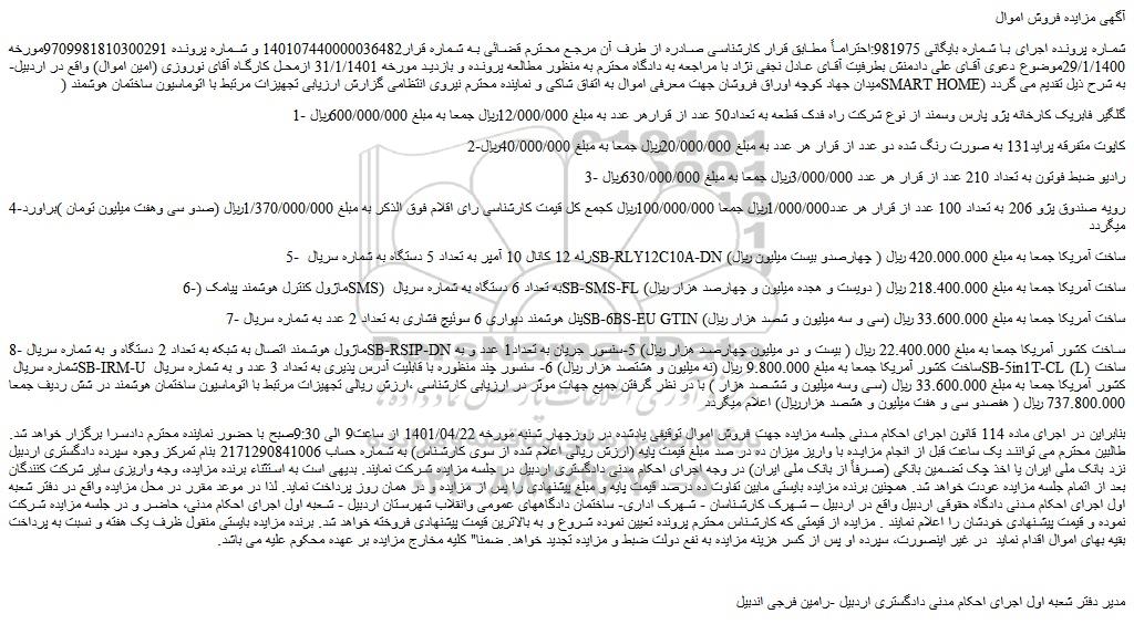 شماره پرونده اجرای با شماره بایگانی 981975:احتراماً مطابق قرار کارشناسی صادره از طرف آن مرجع محترم قضائی به شماره قرار140107440000036482 و شماره پرونده 9709981810300291مورخه 29/1/1400موضوع دعوی آقای علی دادمنش بطرفیت آقای عادل نجفی نژاد با مراجعه به دادگاه محترم به منظور مطالعه پرونده و بازدید مورخه 31/1/1401 ازمحل کارگاه آقای نوروزی (امین اموال) واقع در اردبیل- میدان جهاد کوچه اوراق فروشان جهت معرفی اموال به اتفاق شاکی و نماینده محترم نیروی انتظامی گزارش ارزیابی تجهیزات مرتبط با اتوماسیون ساختمان هوشمند (SMART HOME) به شرح ذیل تقدیم می گردد