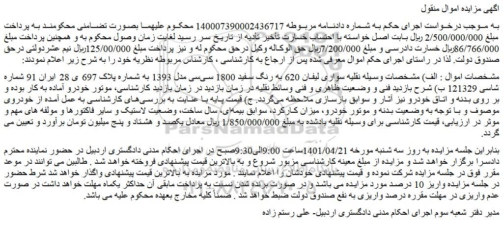 بنابراین جلسه مزایده به روز سه شنبه مورخه 1401/04/21ساعت 9:00الی9:30صبح در اجرای احکام مدنی دادگستری اردبیل در حضور نماینده محترم دادسرا برگزار خواهد شد و مزایده از مبلغ معینه کارشناسی مزبور شروع و به بالاترین قیمت پیشنهادی فروخته خواهد شد . طالبین می توانند در موعد مقرر فوق در جلسه مزایده شرکت نموده و قیمت پیشنهادی خودشان را اعلام نمایند . مورد مزایده به بالاترین قیمت پیشنهادی واگذار خواهد شد شرط حضور در جلسه مزایده واریز 10 درصد مورد مزایده می باشد و در صورت برنده شدن نسبت به پرداخت مابقی آن حداکثر یکماه مهلت خواهد داشت در صورت عدم واریزی در مهلت مقرره درصد واریزی به نفع صندوق دولت ضبط خواهد شد . ضمناً کلیه مخارج بعهده محکوم علیه می باشد.