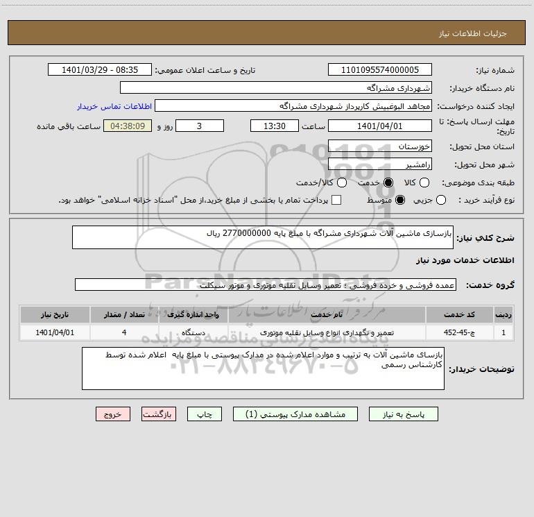 شرح کلی نیاز: بازسازی ماشین آلات شهرداری مشراگه با مبلغ پایه 2770000000 ریال