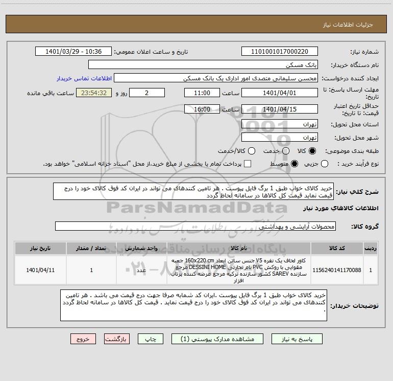 شرح کلی نیاز: خرید کالای خواب طبق 1 برگ فایل پیوست . هر تامین کنندهای می تواند در ایران کد فوق کالای خود را درج قیمت نماید قیمت کل کالاها در سامانه لحاظ گردد