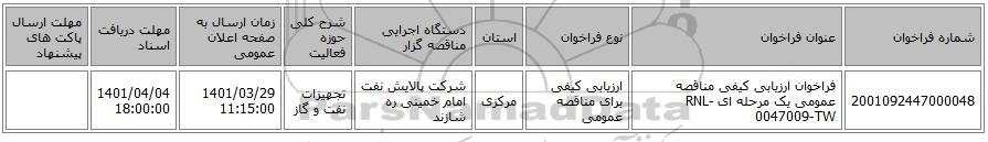 مناقصه، فراخوان ارزیابی کیفی مناقصه عمومی یک مرحله ای RNL-0047009-TW از کلیه افراد متخصص و شرکتها واجد شرایط دعوت به عمل میآید در مناقصه با کد خبرگزاری پارس نماد: 4630920 شرکت نمایند.