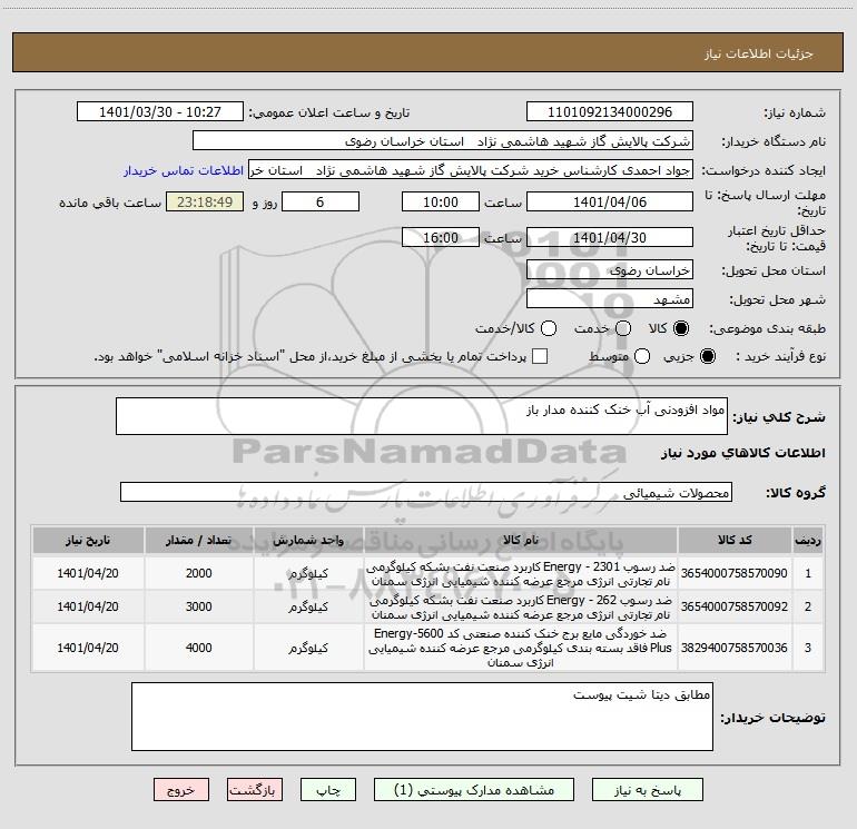 نام دستگاه خریدار:شرکت پالایش گاز شهید هاشمی نژاد استان خراسان رضوی