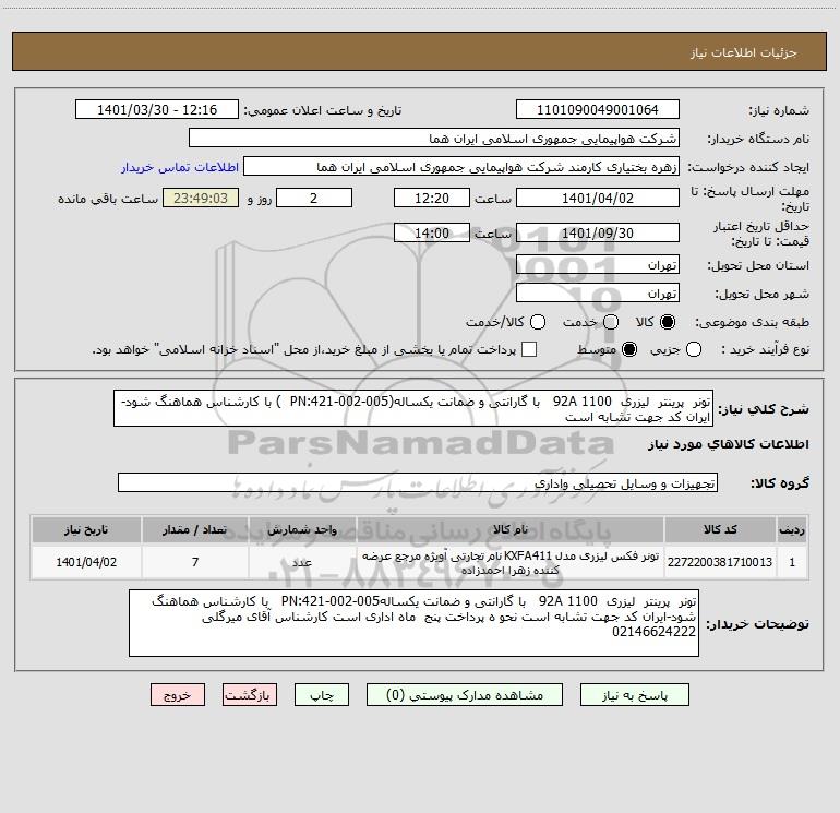 شرح کلی نیاز: تونر پرینتر لیزری 1100 92A با گارانتی و ضمانت یکساله(PN:421-002-005 ) با کارشناس هماهنگ شود-ایران کد جهت تشابه است