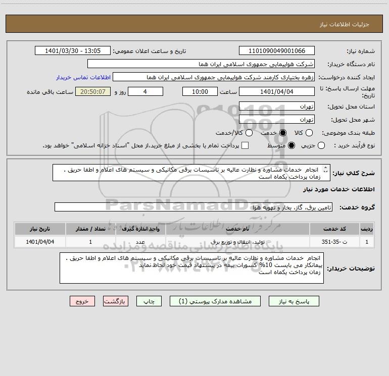شرح کلی نیاز: انجام خدمات مشاوره و نظارت عالیه بر تاسیسات برقی مکانیکی و سیستم های اعلام و اطفا حریق . زمان پرداخت یکماه است