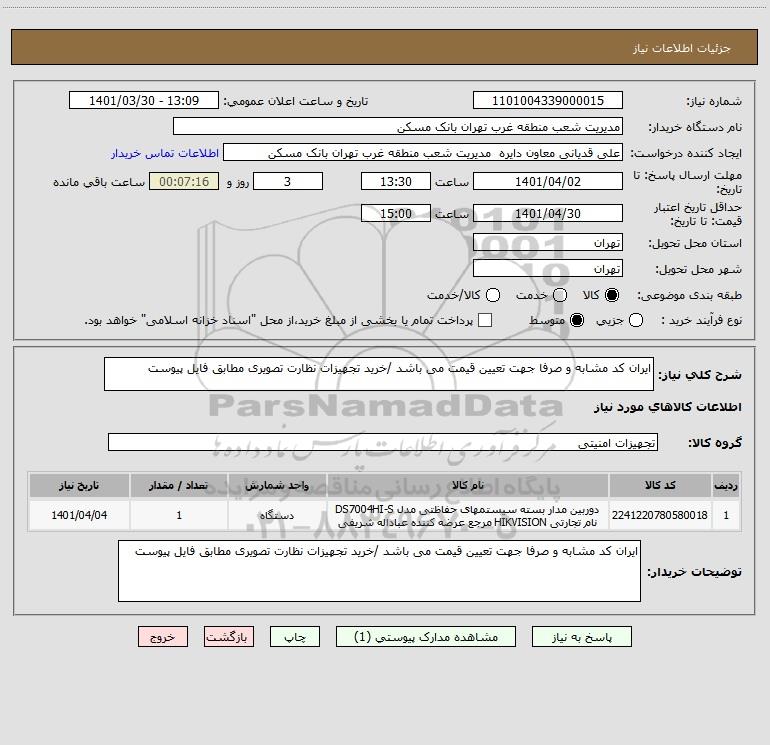 شرح کلی نیاز: ایران کد مشابه و صرفا جهت تعیین قیمت می باشد /خرید تجهیزات نظارت تصویری مطابق فایل پیوست