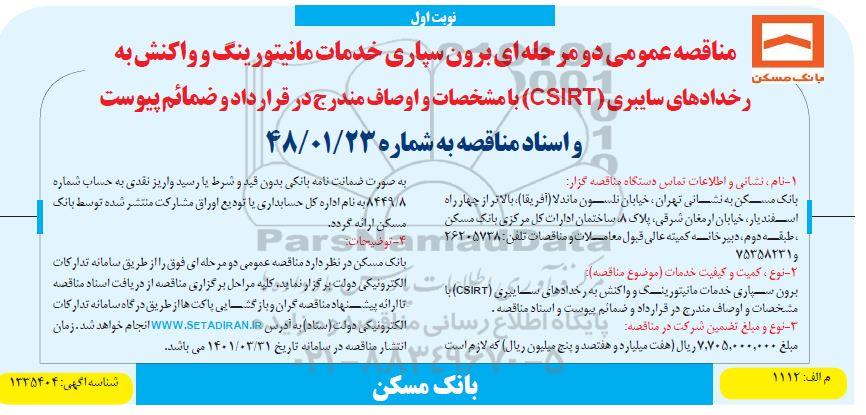مناقصه عمومی دو مرحله ای برون سپاری خدمات مانیتورینگ و واکنش به رخدادهای سایبری CSIRT با مشخصات و اوصاف مندرج در قرارداد و ضمائم پیوست