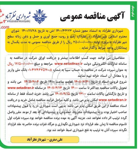 شهرداری نظرآباد به استناد مجوز شماره 1400/4423/ ش به تاریخ 1400.11.28 شورای محترم اسلامی شهر نظرآباد در نظر دارد رفت و روب، جمع آوری و حمل و دفن زباله سطح شهر نظرآباد با براورد اولیه 250.000.000 ریال را از طریق مناقصه عمومی به مدت یکسال به پیمانکاران واجد شرایط واگذار نماید.