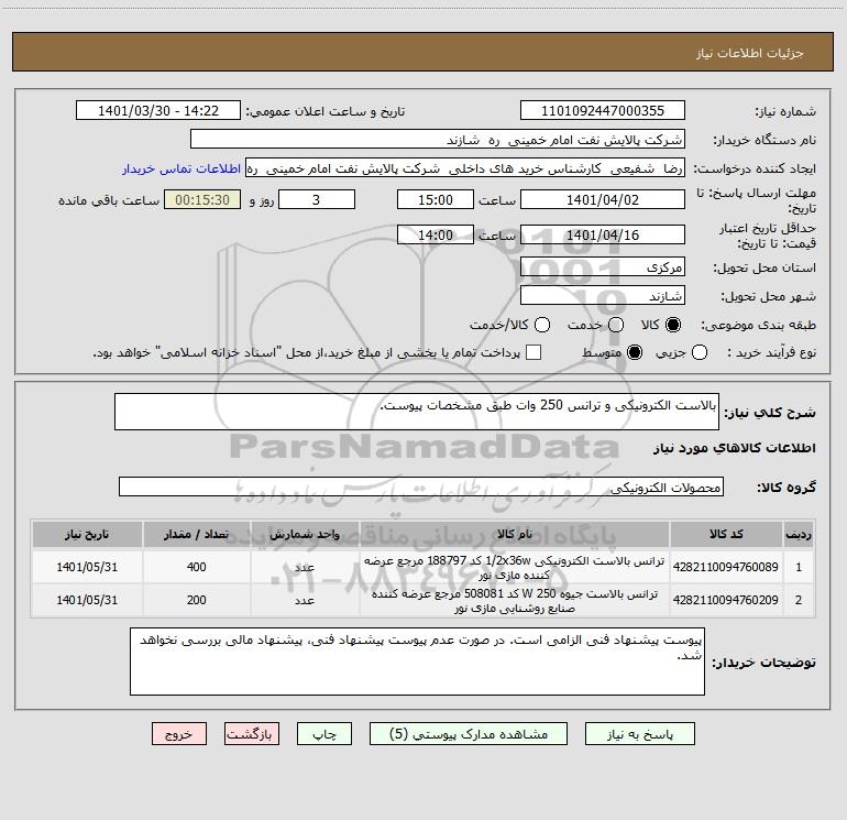 شرح کلی نیاز: بالاست الکترونیکی و ترانس 250 وات طبق مشخصات پیوست.