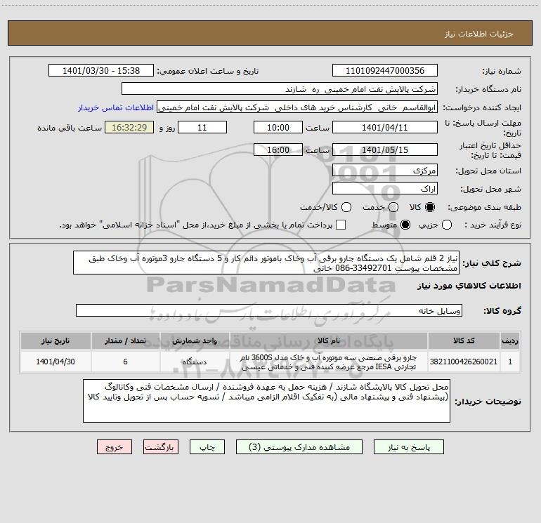 شرح کلی نیاز: نیاز 2 قلم شامل یک دستگاه جارو برقی آب وخاک باموتور دائم کار و 5 دستگاه جارو 3موتوره آب وخاک طبق مشخصات پیوست 33492701-086 خانی
