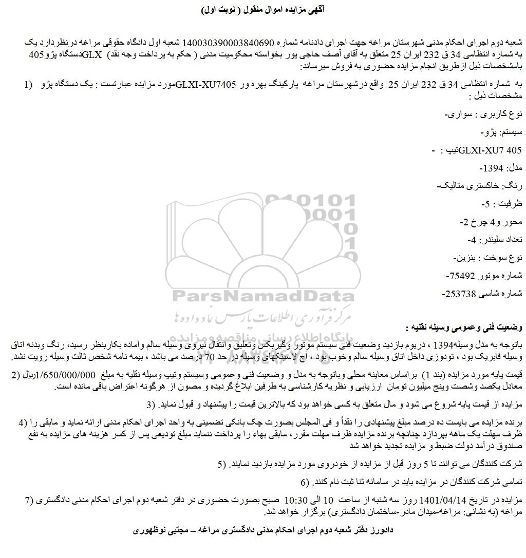 شعبه دوم اجرای احکام مدنی شهرستان مراغه جهت اجرای دادنامه شماره 140030390003840690 شعبه اول دادگاه حقوقی مراغه درنظردارد یک دستگاه پژو405 GLX به شماره انتظامی 34 ق 232 ایران 25 متعلق به آقای آصف حاجی پور بخواسته محکومیت مدنی ( حکم به پرداخت وجه نقد) بامشخصات ذیل ازطریق انجام مزایده حضوری به فروش میرساند: