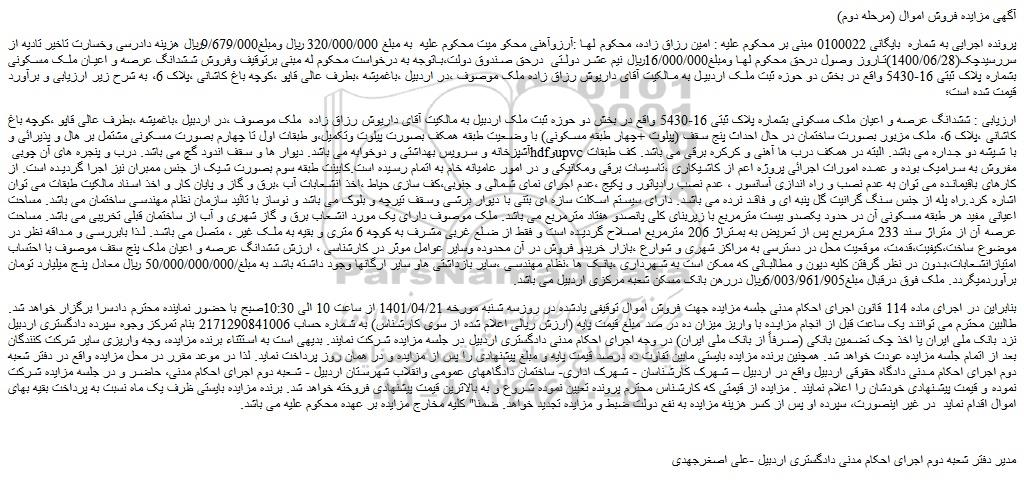 پرونده اجرایی به شماره بایگانی 0100022 مبنی بر محکوم علیه : امین رزاق زاده، محکوم لها :آرزوآهنی محکو میت محکوم علیه به مبلغ 320/000/000 ریال ومبلغ9/679/000ریال هزینه دادرسی وخسارت تاخیر تادیه از سررسیدچک(1400/06/28)تاروز وصول درحق محکوم لها ومبلغ16/000/000ریال نیم عشر دولتی درحق صندوق دولت،باتوجه به درخواست محکوم له مبنی برتوقیف وفروش ششدانگ عرصه و اعیان ملک مسکونی بشماره پلاک ثبتی 16-5430 واقع در بخش دو حوزه ثبت ملک اردبیل به مالکیت آقای داریوش رزاق زاده ملک موصوف ،در اردبیل ،باغمیشه ،بطرف عالی قاپو ،کوچه باغ کاشانی ،پلاک 6، به شرح زیر ارزیابی و برآورد قیمت شده است؛