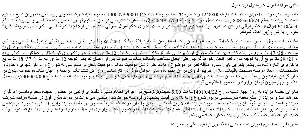 مشخصات اموال : عبارت است از ششدانگ عرصه و اعیان یک قطعه زمین بشماره پلاک ملک 269/ 86 واقع در بخش سه حوزه ثبتی اردبیل به نشانی روستای ملاباشی،روبروی قبرستان،بین بهداشت و مسجد زمین مطابق نقشه تصویر کاداستر به مساحت 1/ 47 مترمربع و مطابق بازدید مامور فنی شهرداری منطقه 3 اردبیل به مساحت 58/ 47 مترمربع می باشد که مطابق استعلام معمول از شهرداری متبوع ،ملک در تعریض خیابان 12 متری واقع شده و با کاربری کودکستان و عملکرد مسکونی بوده و 21/ 29 مترمربع آن به کوچه مورد نظر الحاق خواهد گردید. علی ایحال مساحت باقیمانده ملک موصوف پس از اعمال تعریض کوچه 12 متری ،به متراژ 37/ 18 مترمربع با کاربری اشاره شده می باشد. بنابراین بابررسی و مداقه نظر در موضوع و با مدّ نظر داشتن موقعیت ملک ، موقعیت محل در دسترسی به شوارع و مراکز شهری ، حدود و مشخصات و ابعاد عرصه مساحت باقیمانده، بازار خریدو فروش در آن محدوده وسایر عوامل موثر در کارشناسی ، ارزش ششدانگ عرصه و اعیان ملک موصوف ،بدون در نظر گرفتن کلیه دیون و مطالباتی که ممکن است به شهرداری ،بانک ها ،نظام مهندسی ،سایر بازداشتی هاو سایر ارگانها وجود داشته باشد به مبلغ740/000/000ریال معادل هفتاد و چهارمیلیون تومان برآورد و بحضور اعلام می گردد.