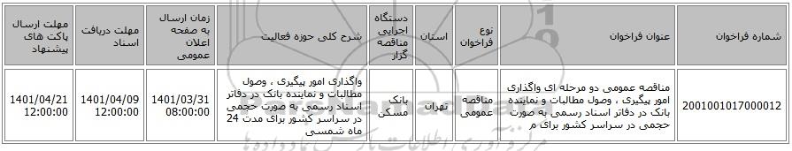 مناقصه، مناقصه عمومی دو مرحله ای واگذاری امور پیگیری ، وصول مطالبات و نماینده بانک در دفاتر اسناد رسمی به صورت حجمی در سراسر کشور برای م, مناقصه، مناقصه عمومی دو مرحله ای واگذاری امور پیگیری ، وصول مطالبات و نماینده بانک در دفاتر اسناد رسمی به صورت حجمی در سراسر کشور برای م