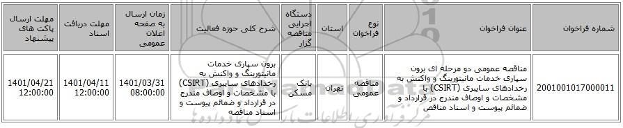مناقصه، مناقصه عمومی دو مرحله ای برون سپاری خدمات مانیتورینگ و واکنش به رخدادهای سایبری (CSIRT) با مشخصات و اوصاف مندرج در قرارداد و ضمائم پیوست و اسناد مناقص, مناقصه، مناقصه عمومی دو مرحله ای برون سپاری خدمات مانیتورینگ و واکنش به رخدادهای سایبری (CSIRT) با مشخصات و اوصاف مندرج در قرارداد و ضمائم پیوست و اسناد مناقص