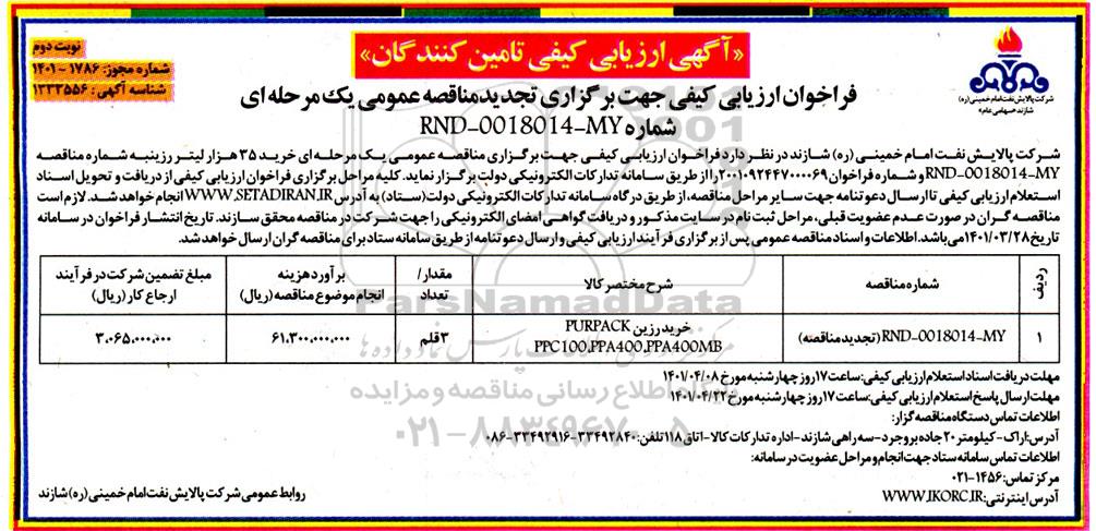 RND-0018014-MY تجدید مناقصهخرید رزین PURPACK PPC100, PPA400, PPA400 MB3 قلم61.300.000.0003.065.000.000