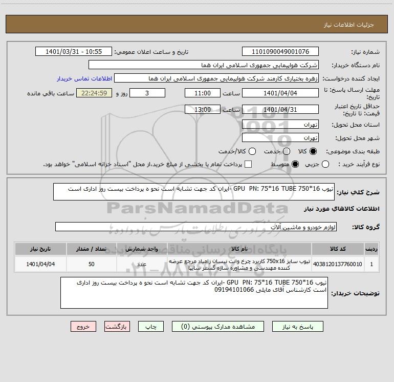 استعلام تیوب 16*750 GPU PN: 75*16 TUBE -ایران کد جهت تشابه است نحو ه پرداخت بیست روز اداری است, استعلام تیوب 16*750 GPU PN: 75*16 TUBE -ایران کد جهت تشابه است نحو ه پرداخت بیست روز اداری است