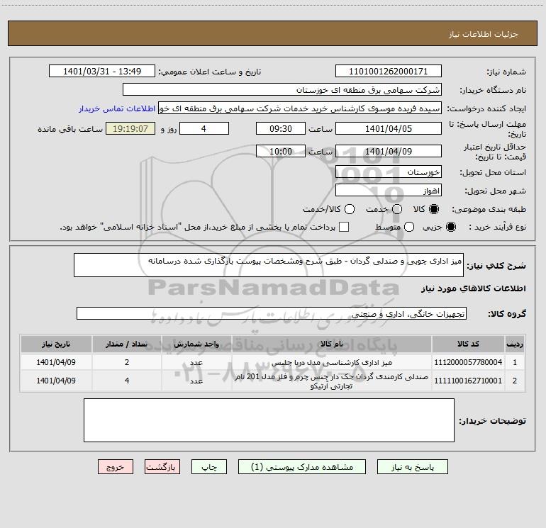 شرح کلی نیاز: میز اداری چوبی و صندلی گردان - طبق شرح ومشخصات پیوست بارگذاری شده درسامانه