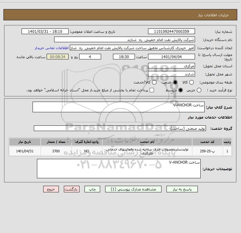استعلام بها و موضوع استعلام استعلام ساخت V-ANCHOR به اطلاع کلیه شرکت‌ها و افراد متخصص واجد شرایط می‌رساند، آگهی گذار در نظر دارد از طریق استعلام بها، نسبت به انتخاب و دریافت پیشنهادات اقدام نماید. این استعلام با کد آگهی ثبت شده در سامانه خبرگزاری پارس نماد : 4642580 منتشر شده است. مشخصات استعلام : تاریخ شروع استعلام: 1401/03/31 آخرین مهلت ارسال پیشنهاد قیمت : 1401/04/04 و محل اجرای پروژه : استان مرکزی میباشد. استعلام قیمت مورد درخواست : استعلام ساخت V-ANCHOR با دسته‌بندی‌های تخصصی و گروه های مرتبط : تجهیزات نفت و گاز, تجهیزات و ماشین آلات صنعتی, استعلام اطلاع رسانی میگردد.