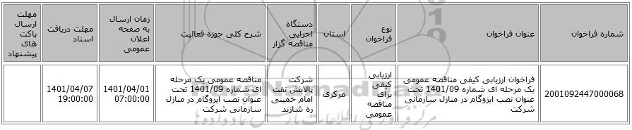 مناقصه، فراخوان ارزیابی کیفی مناقصه عمومی یک مرحله ای شماره 1401/09 تحت عنوان نصب ایزوگام در منازل سازمانی شرکت, مناقصه، فراخوان ارزیابی کیفی مناقصه عمومی یک مرحله ای شماره 1401/09 تحت عنوان نصب ایزوگام در منازل سازمانی شرکت