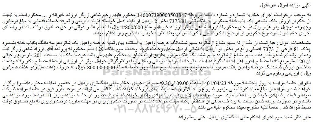 به موجب درخواست اجرای حکم به شماره و شماره دادنامه مربوطه 140007390003503847 محکوم علیهم رحیم شاهی زرگر فرزند خیراله و ... محکوم است به تبعیت از حکم بر فروش ملک مشاعی یک باب خانه مسکونی به پلاک ثبتی 7373/81 بخش 2 اردبیل از بابت اصل خواسته هزینه دادرسی و تعرفه خدمات قضایی به مبلغ دومیلیون وچهارصدوچهل ودو هزار ریال در حق محکوم له فرزاد شاهی زرگر فرزند خیرالله و مبلغ 1/800/000 ریال بابت نیم عشر دولتی در حق صندوق دولت . لذا در راستای اجرای حکم اموال موضوع حکم پس از ارجاع به کارشناسی ، کارشناس مربوطه نظریه خود را به شرح زیر اعلام نمودند: