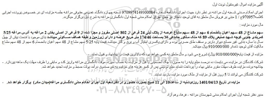 - مزایده در تاریخ 1401/04/13 روزدوشنبه از ساعت10 الی 11 صبح بصورت حضوری در دفترشعبه اول اجرای احکام مدنی دادگستری مراغه(میدان مادر) برگزار خواهد شد.