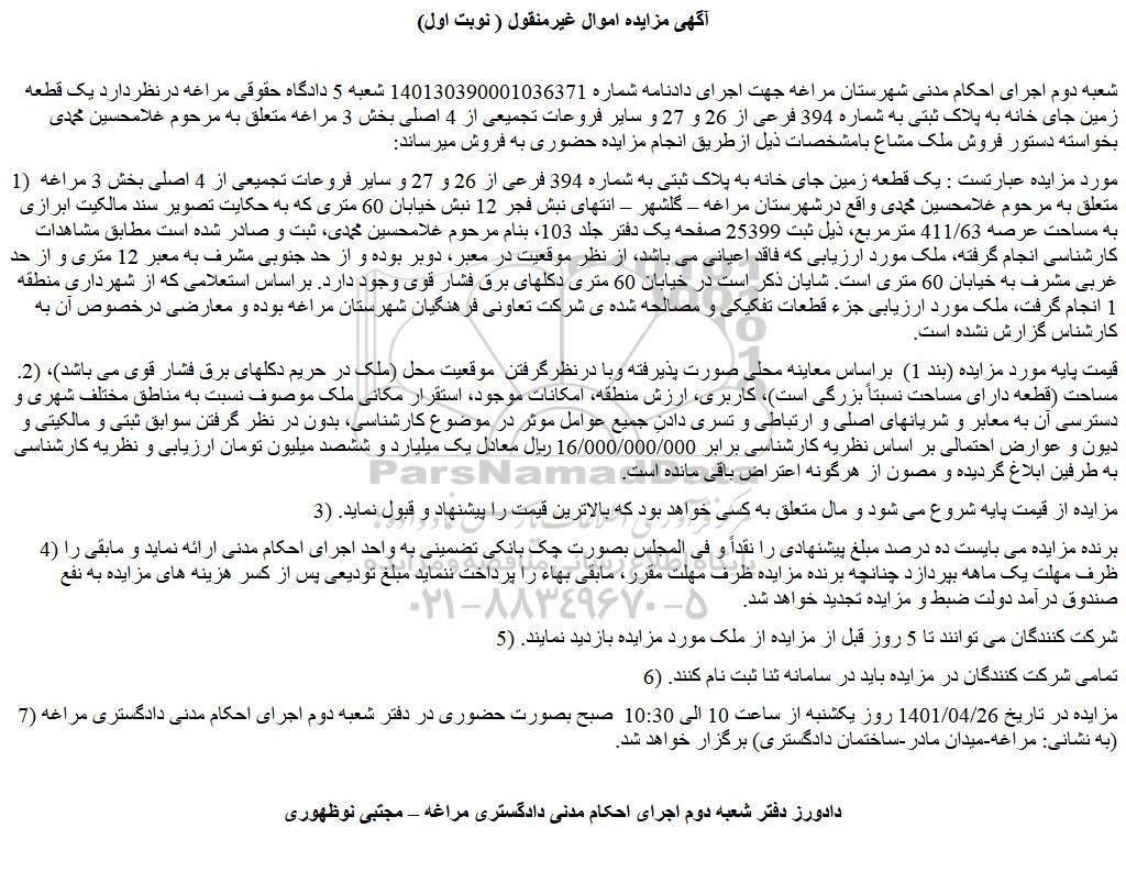 شعبه دوم اجرای احکام مدنی شهرستان مراغه جهت اجرای دادنامه شماره 140130390001036371 شعبه 5 دادگاه حقوقی مراغه درنظردارد یک قطعه زمین جای خانه به پلاک ثبتی به شماره 394 فرعی از 26 و 27 و سایر فروعات تجمیعی از 4 اصلی بخش 3 مراغه متعلق به مرحوم غلامحسین محمدی بخواسته دستور فروش ملک مشاع بامشخصات ذیل ازطریق انجام مزایده حضوری به فروش میرساند: