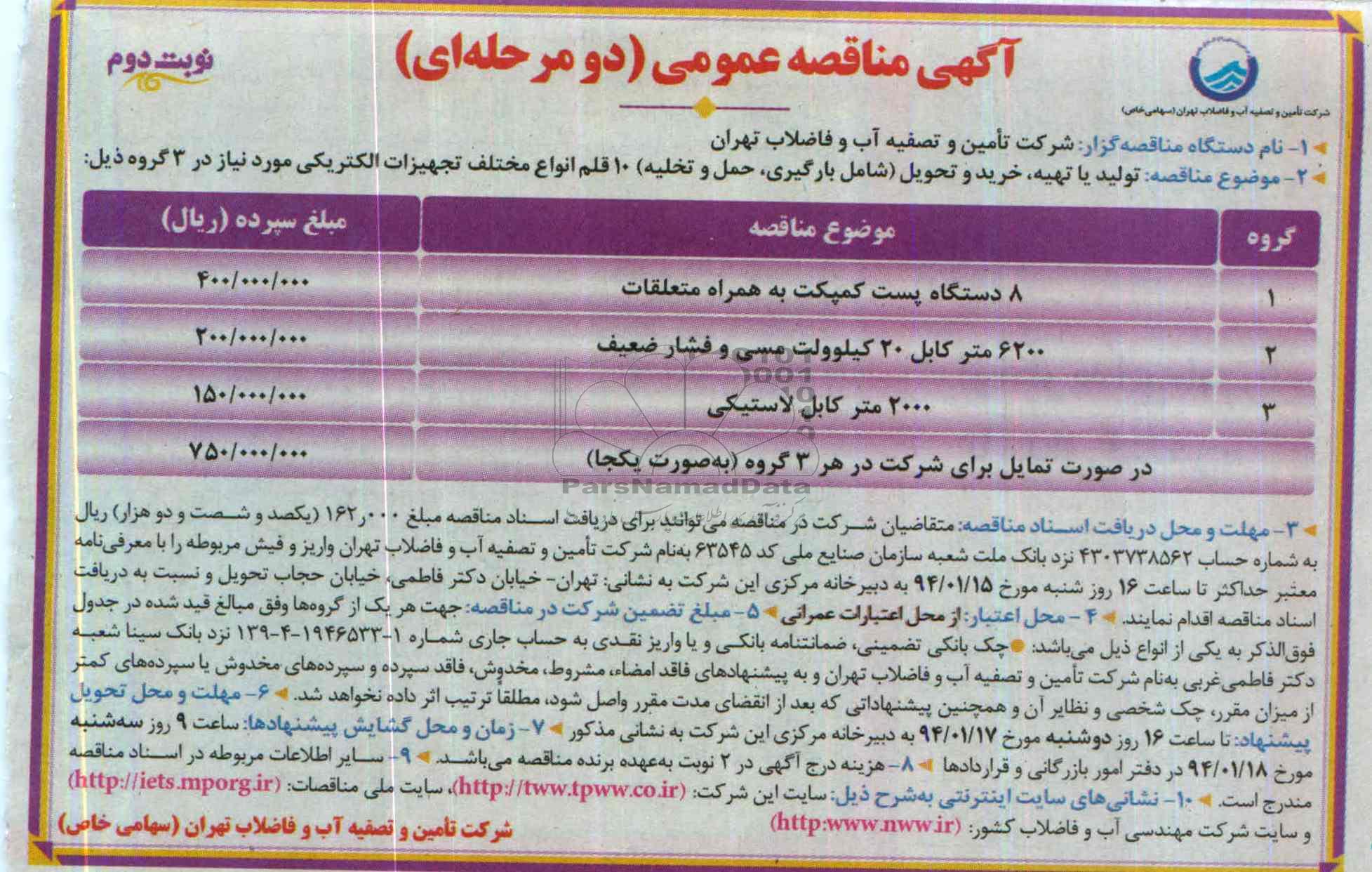 موضوع مناقصه: تولید یا تهیه، خرید و تحویل (شامل بارگیری، حمل و تخلیه) 10 قلم انواع مختلف تجهیزات الکتریکی مورد نیاز در 3 گروه ذیل