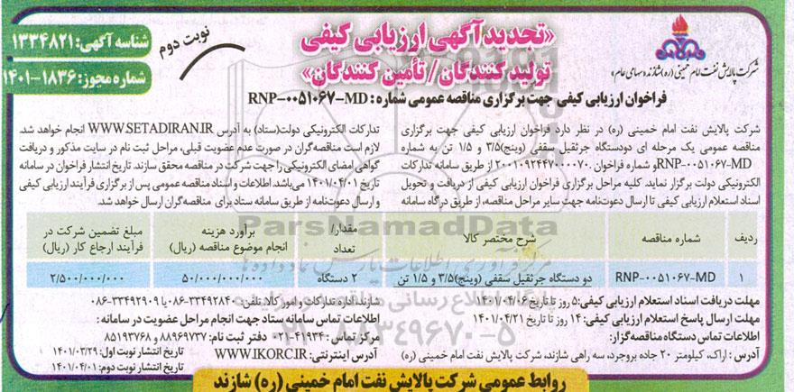 شرکت پالایش نفت امام خمینی (ره) در نظر دارد فراخوان ارزیابی کیفی جهت برگزاری مناقصه عمومی یک مرحله ای  دو دستگاه جرثقیل سقفی (وینج ) 3.5 و 1.5 تن به شماره RNp-0051067-Md   شماره فراخوان 2001092447000070 را از طریق سامانه تدارکات الکترونیکی دولت برگزار کند. کلیه مراحل برگزاری فراخوان ارزیابی کیفی از دریافت و تحویل اسناد استعلام ارزیابی کیفی تا ارسال دعوت نامه جهت سایر مراحل مناقصه از طریق درگاه سامانه تدارکات الکترونیکی دولت ستاد به آدرس ستاد ایران انجام خواهد شد لازم است مناقصه گران در صورت عدم عضویت قبلی مراحل ثبت نام در سایت مذکور و دریافت گواهی امضای الکترونیکی ار جهت شرکت در مناقصه محقق سازند. تاریخ انتشار فراخوان در سامانه تاریخ 1401.4.1می باشد. اطلاعات و اسناد مناقصه عمومی پس از برگزاری فرآیند ارزیابی کیفی و ارسال دعوتنامه از طریق سامانه ستاد برای مناقصه گران ارسال خواهد شد.