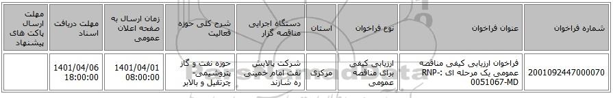 مناقصه، فراخوان ارزیابی کیفی مناقصه عمومی یک مرحله ای :RNP-0051067-MD, مناقصه، فراخوان ارزیابی کیفی مناقصه عمومی یک مرحله ای :RNP-0051067-MD