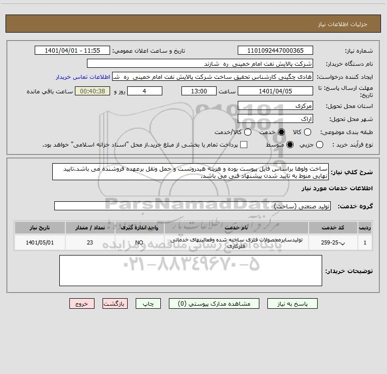 شرح کلی نیاز: ساخت ولوها براساس فایل پیوست بوده و هزینه هیدروتست و حمل ونقل برعهده فروشنده می باشد.تایید نهایی منوط به تایید شدن پیشنهاد فنی می باشد.