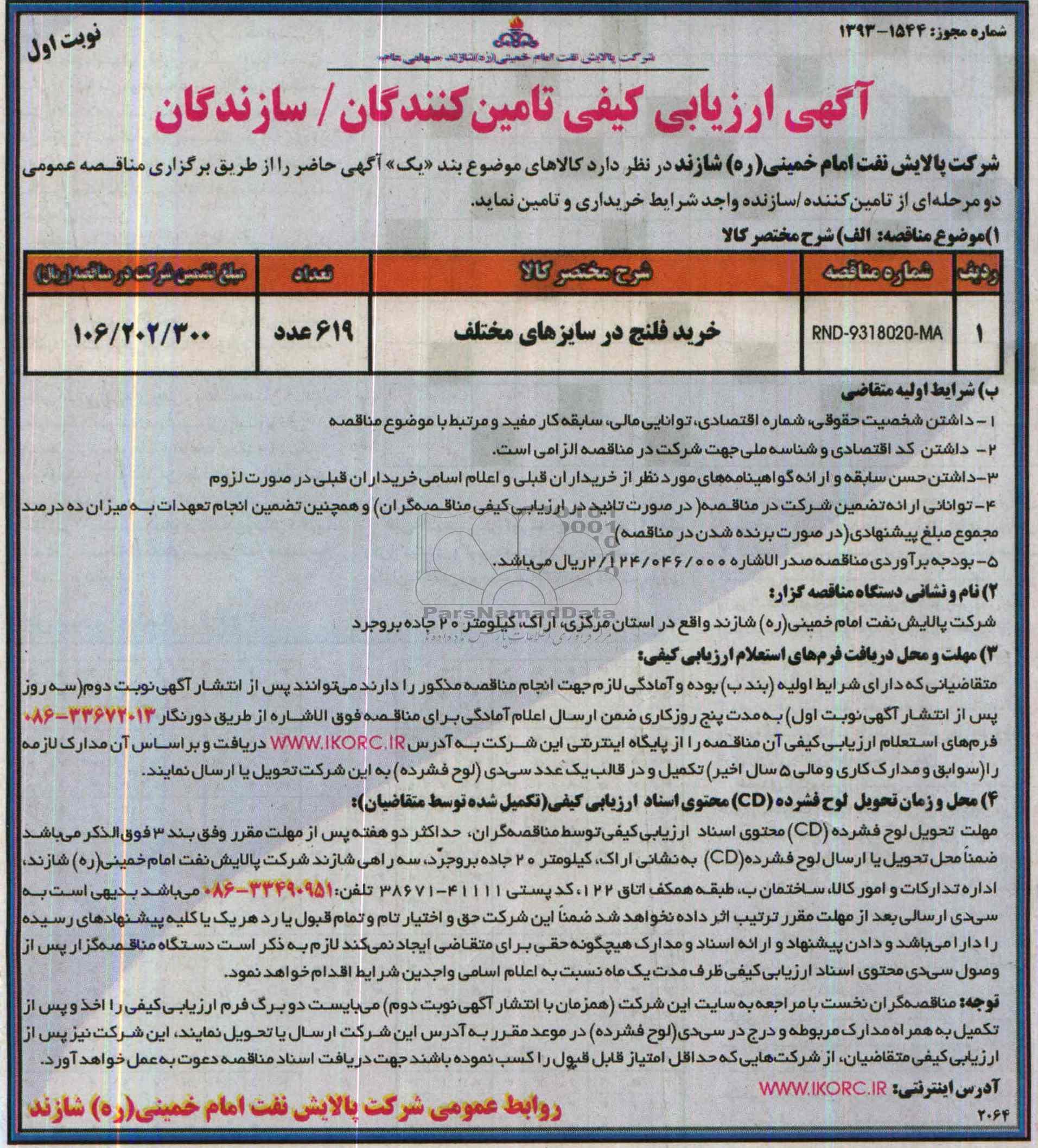 شرکت پالایش نفت امام خمینی ره شازند در نظر دارد کالای موضوع بند یک آگهی حاضر را از طریق برگزاری مناقصه عمومی دو مرحله ای ازتامین کننده واجد شرایط خریداری و تامین نماید.