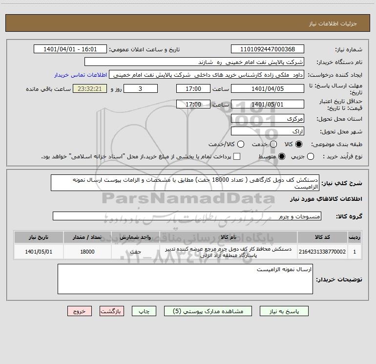 شرح کلی نیاز: دستکش کف دوبل کارگاهی ( تعداد 18000 جفت) مطابق با مشخصات و الزامات پیوست ارسال نمونه الزامیست