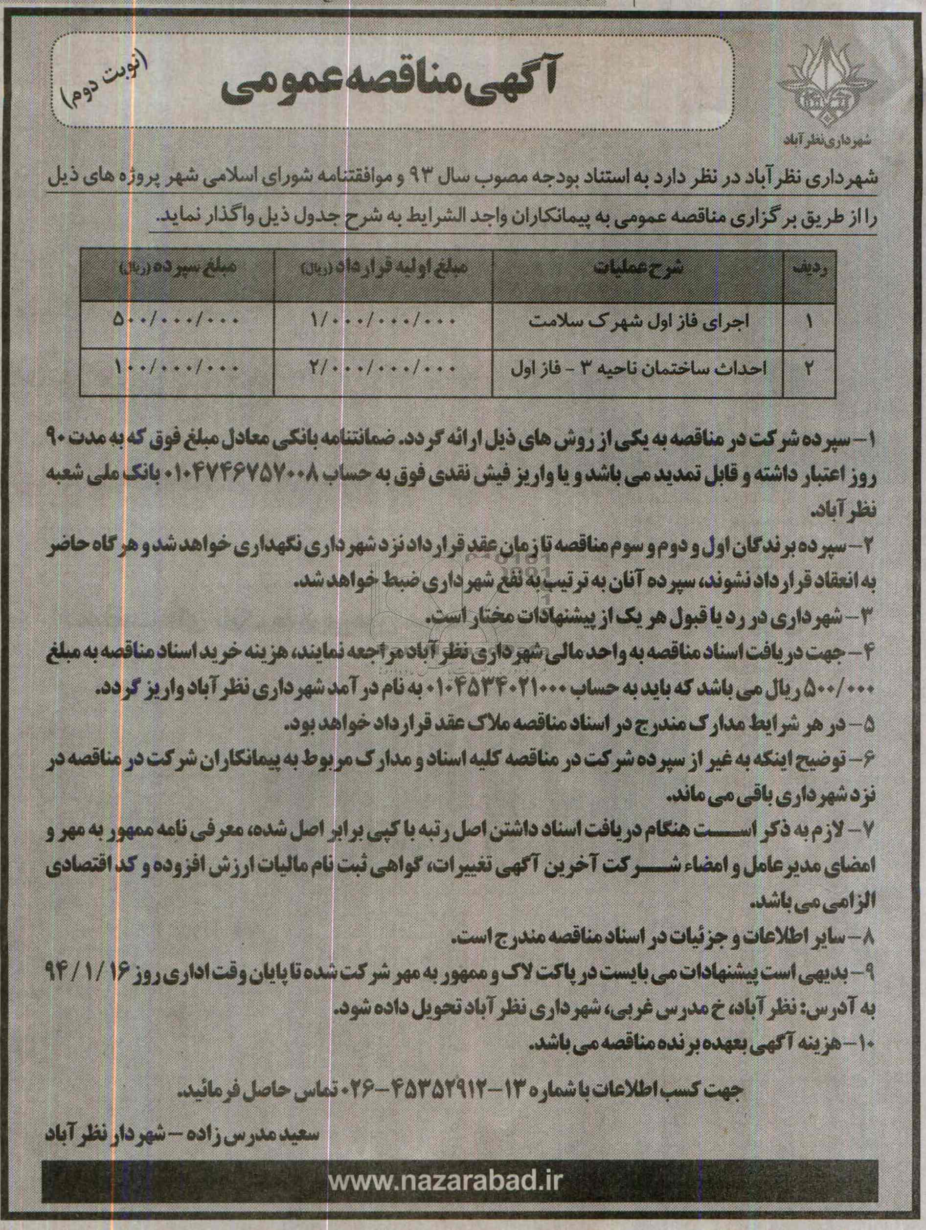 شهرداری نظرآباد در نظر دارد به استناد بودجه مصوب سال 93 و موافقتنامه شورای اسلامی شهر پروژه های ذیل را از طریق برگزاری مناقصه عمومی به پیمانکاران واجدالشرایط به شرح جدول ذیل واگذار نماید
