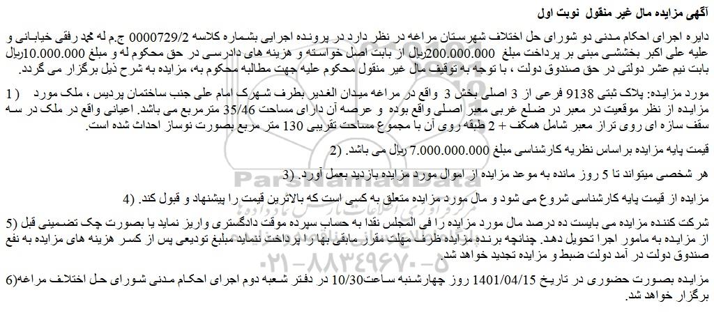 2) قیمت پایه مزایده براساس نظریه کارشناسی مبلغ 7.000.000.000 ریال می باشد.