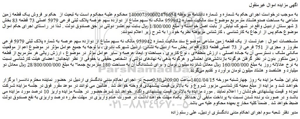 به موجب درخواست اجرای حکم به شماره و شماره دادنامه مربوطه 140007390002476654 محکوم علیه محکوم است به تبعیت از حکم بر فروش یک قطعه زمین مشاعی به مساحت صدوهشتاد مترمربع موضوع سند مالکیت شماره 959942 مالک نه سهم مشاع از دوازده سهم عرصه پلاک ثبتی فرعی 5979 اصلی 73 قطعه 83 بخش 3 شهرستان اردبیل واقع در شهرک نیایش از بابت اصل خواسته و مبلغ 1/800/000 ریال بابت نیم عشر دولتی در حق صندوق دولت . لذا در راستای اجرای حکم اموال موضوع حکم پس از ارجاع به کارشناسی ، کارشناس مربوطه نظریه خود را به شرح زیر اعلام نمودند: