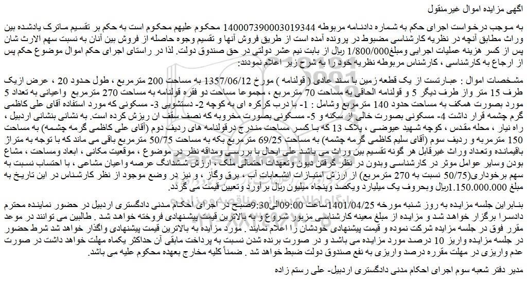 بنابراین جلسه مزایده به روز شنبه مورخه 1401/04/25ساعت 09:00الی9:30صبح در اجرای احکام مدنی دادگستری اردبیل در حضور نماینده محترم دادسرا برگزار خواهد شد و مزایده از مبلغ معینه کارشناسی مزبور شروع و به بالاترین قیمت پیشنهادی فروخته خواهد شد . طالبین می توانند در موعد مقرر فوق در جلسه مزایده شرکت نموده و قیمت پیشنهادی خودشان را اعلام نمایند . مورد مزایده به بالاترین قیمت پیشنهادی واگذار خواهد شد شرط حضور در جلسه مزایده واریز 10 درصد مورد مزایده می باشد و در صورت برنده شدن نسبت به پرداخت مابقی آن حداکثر یکماه مهلت خواهد داشت در صورت عدم واریزی در مهلت مقرره درصد واریزی به نفع صندوق دولت ضبط خواهد شد . ضمناً کلیه مخارج بعهده محکوم علیه می باشد.