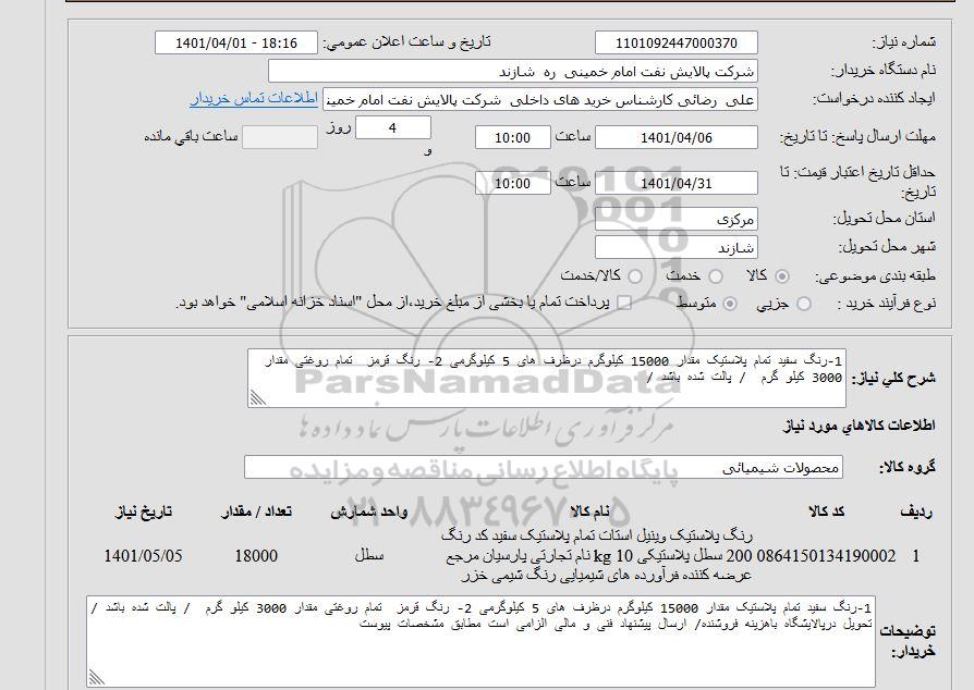شرح کلی نیاز: 1-رنگ سفیدتمام پلاستیک مقدار 15000 کیلوگرم در ظرف های 5 کیلوگرمی 2- رنگ قرمز تمام روغنی مقدرا 3000 کیلوگرم، پالت شده باشد.