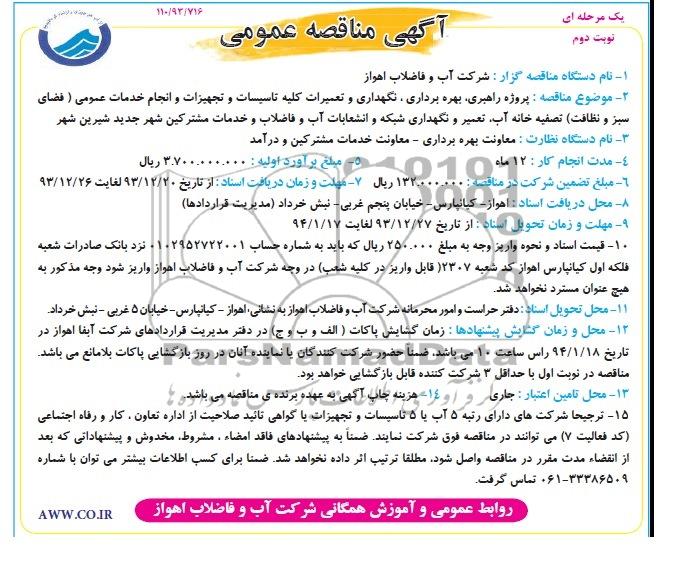 موضوع مناقصه: پروژه راهبری ، بهره برداری ، نگهداری و تعمیرات کلیه تاسیسات و تجهیزات و انجام خدمات عمومی (فضای سبز و نظافت) تصفیه خانه آب ، تعمیر و نگهداری شبکه و انشعابات آب و فاضلاب و خدمات مشترکین شهر جددی شیرین شهر