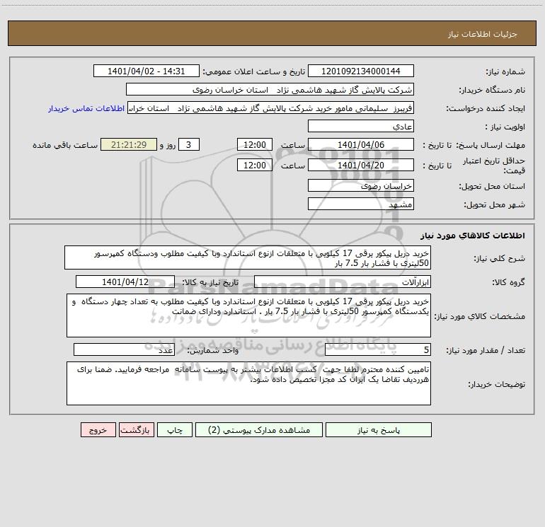 نام دستگاه خریدار:شرکت پالایش گاز شهید هاشمی نژاد استان خراسان رضوی